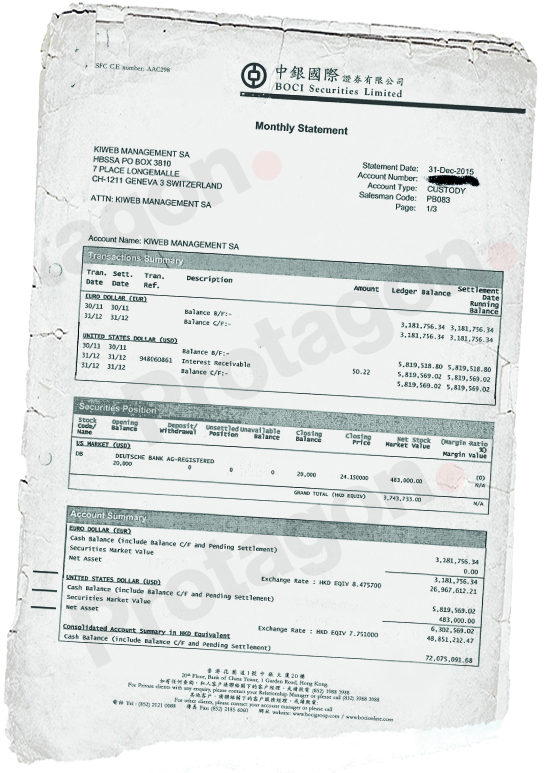 Ανάμεσα στα έγγραφα εντοπίστηκε και μία μηνιαία κατάσταση λογαριασμού τράπεζας του Χονγκ Κονγκ, του Δεκεμβρίου 2015, όπου φαινόταν ότι η Kiweb είχε περίπου 3,1 εκατομμύρια ευρώ, 5,8 εκατομμύρια δολάρια και μετοχές της Deutsche Bank αξίας 480.000 δολαρίων.