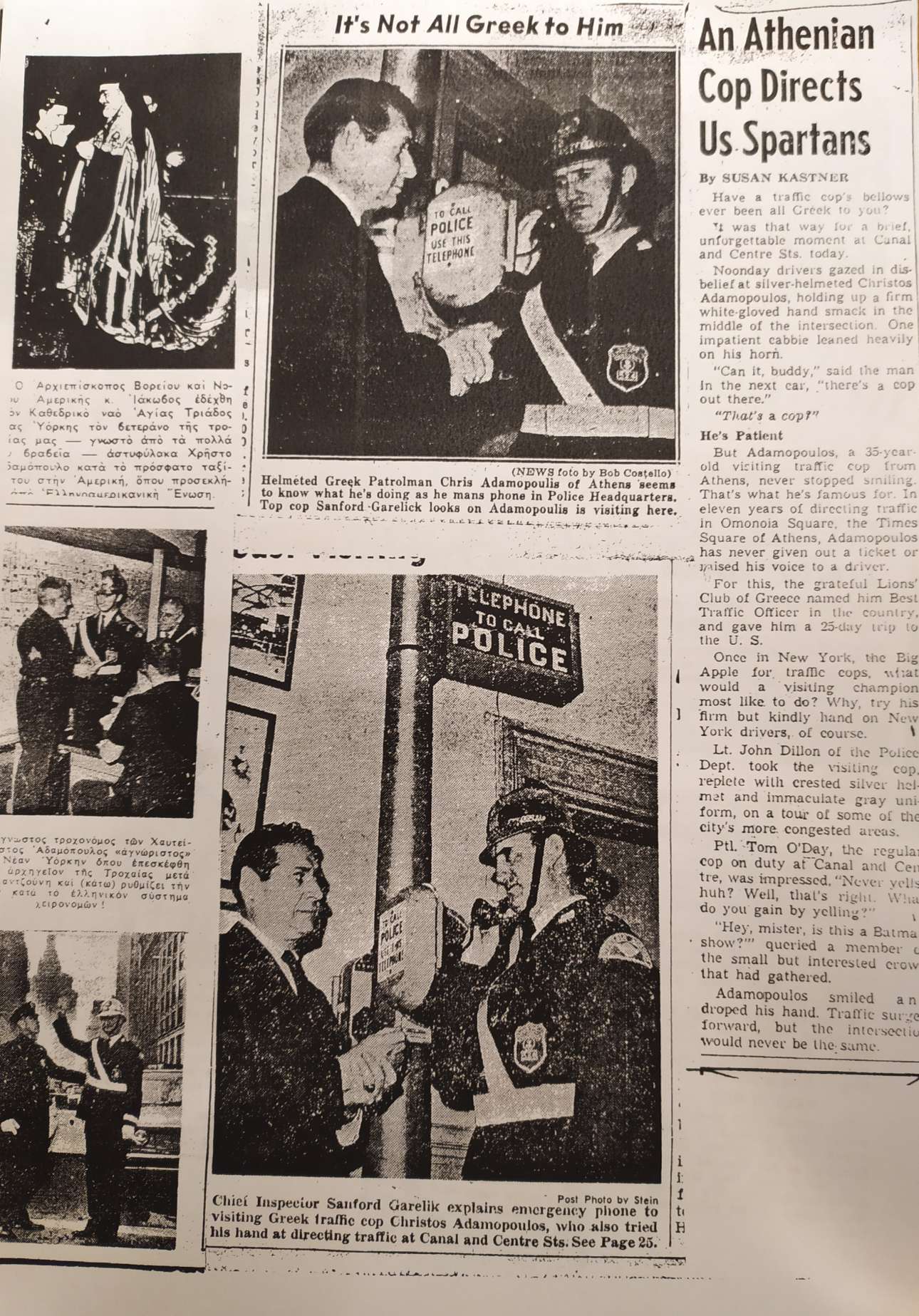 Οι φωτορεπόρτερ που δίνουν και το βασίλειο τους για ενσταντανέ με ντίβες της εποχής, τον απαθανατίζουν στο πόστο του με την ιταλίδα ηθοποιό Σάντρα Μίλο. Γνωστή ήδη από τους ρόλους της στο «8 ½» και την «Ιουλιέτα των Πνευμάτων» του Φελίνι, η Μίλο επισκέπτεται την Αθήνα, χωρίς να παραλείψει να φωτογραφηθεί με τον Χρήστο Αδαμόπουλο. Το σκηνικό σουρεάλ, θα το ζήλευε και ο παμμέγιστος «Φεντερίκο»: η κυκλοφορία στα Χαυτεία έχει σταματήσει και ο τροχονόμος την ξεναγεί στην πόλη.