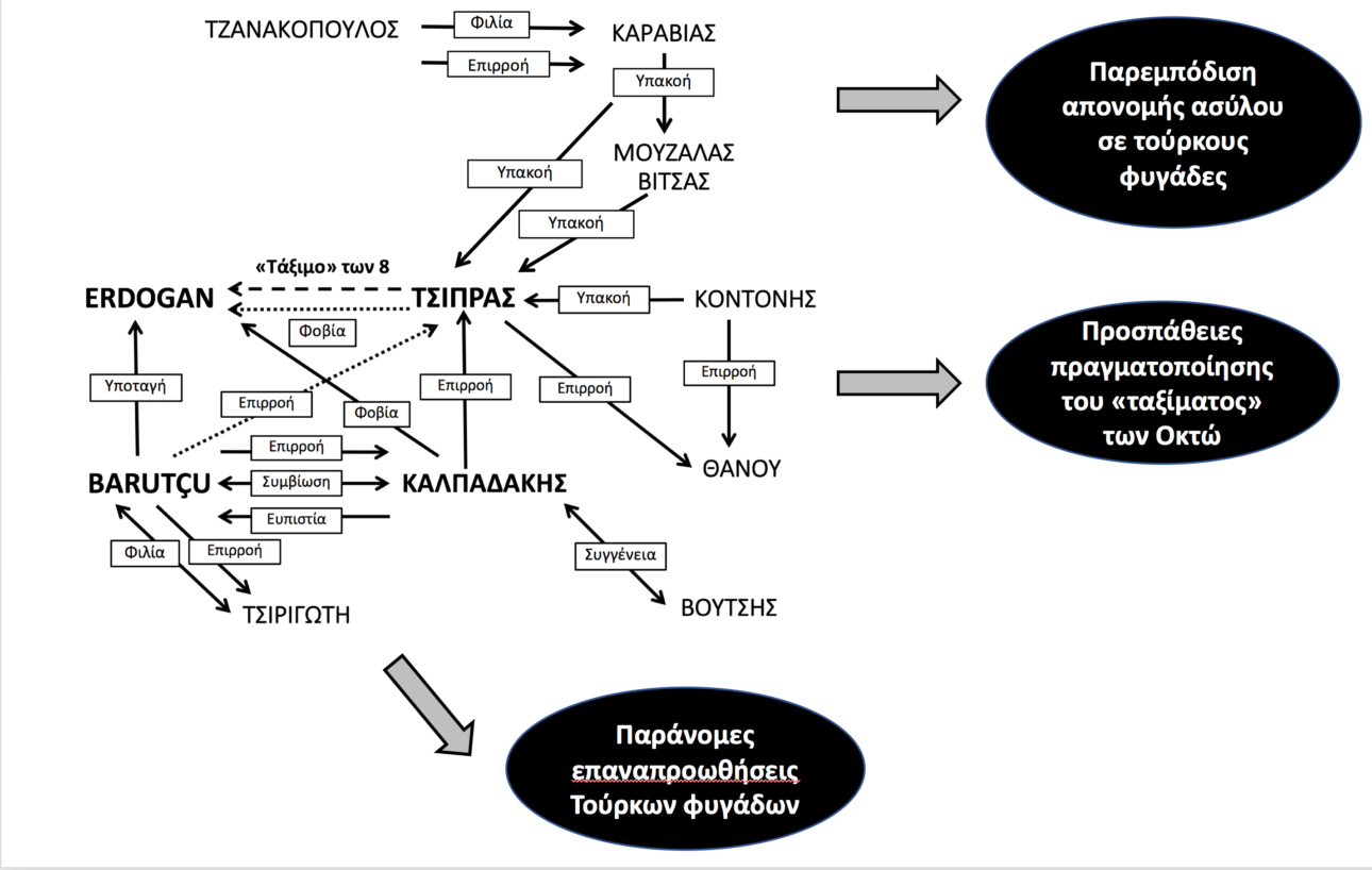 Τελειώνω λέγοντας ότι από τα ονόματα που αναφέρθηκαν εδώ, πλην των δύο πρωταγωνιστών, Ερντογάν και Τσίπρα, και των γνωστών πολιτικών, για τους οποίους ενημερωνόμαστε από τα ΜΜΕ, οι κ.κ. Αποστολάκης, Καλπαδάκης και Τσιριγώτη ανήκουν τώρα επίσημα στο σκιώδες ΚΥΣΕΑ του ΣΥΡΙΖΑ. Ο κ. Ρουμπάτης, πήγε σπίτι του. Η σχέση Καλπαδάκη-Barutçu, από όσο γνωρίζω έχει λήξει. Εκείνη, με το που άλλαξε η κυβέρνηση στην Αθήνα, επέστρεψε το καλοκαίρι του 2019 στην Αγκυρα και υπηρετεί στη Γενική Διεύθυνση Αεροναυτιλίας και Ασφάλειας Συνόρων, αν αυτό σας λέει κάτι. Ο κ. Καραβίας ωστόσο παραμένει και σήμερα διευθυντής της Υπηρεσίας Ασύλου.