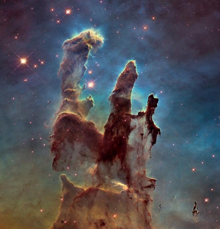 Είναι η διασημότερη φωτογραφία που έχει τραβήξει το Hubble και θεωρείται το σήμα κατατεθέν του. Πρόκειται για τους «Στύλους της Δημιουργίας», τις γιγάντιες στήλες μοριακού υδρογόνου και σκόνης στο Νεφέλωμα του Αετού. Οι στύλοι είναι τόσο πυκνοί, που τα αέρια στο εσωτερικό τους καταρρέουν βαρυτικά, σχηματίζοντας νέα άστρα. Στην κορυφή κάθε στύλου νεαρά φωτεινά άστρα εκτινάσσουν με την ακτινοβολία ύλη χαμηλής πυκνότητας, αποκαλύπτοντας έτσι τα αστρικά μαιευτήρια που κρύβονταν από κάτω. Τελευταίες παρατηρήσεις δείχνουν ότι οι στύλοι έχουν διαλυθεί εξαιτίας κάποιου κοσμικού φαινομένου, πιθανότατα κάποιας έκρηξης σουπερνόβα που συνέβη εκεί.