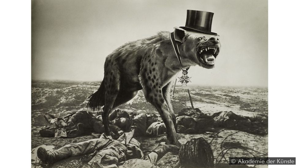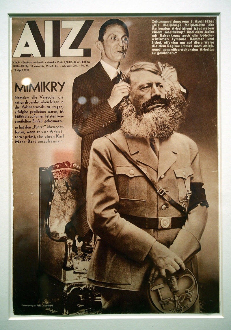Οπλισμένος μόνο με χαρτί, ψαλίδι και κόλλα, σύντομα ο Χέρτφιλντ άρχισε έναν αποτελεσματικό πόλεμο ενάντια στα ψέματα και την υποκρισία τους. «Δείχνει πόσο άστατοι είναι», λέει η Σουλτς. «Υπάρχει το μοντάζ “Mimicry”, όπου βλέπετε τον Γκέμπελς να βάζει γενειάδα του Μαρξ στον Χίτλερ για να προσελκύσει περισσότερες ψήφους εργατικής τάξης».
