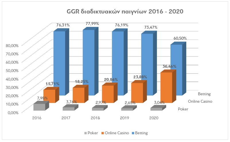 Ο βασιλιάς των παιχνιδιών είναι βεβαίως το στοίχημα. Ό,τι υπάρχει σε «betting» έχει σουξέ. Ενδιαφέρον όμως κρύβει και η δυναμική του πράγματος σε ένα άλλο πεδίο: «(…) τα παίγνια Online Casino παρουσιάζουν σταθερά αυξητική τάση από 15,71% (2016) σε 36,46% (2020). Στα παίγνια On line Casino περιλαμβάνονται τα virtual slots καθώς και τα live casino games. Τέλος, τα παίγνια Poker ενώ κινούνταν πτωτικά από το έτος 2016 (7,98%) έως το έτος 2019 (2,65%), το έτος 2020 παρουσίασαν αύξηση στο ποσοστό συμμετοχής τους επί των συνολικά ακαθάριστων εσόδων, το οποίο διαμορφώθηκε τελικά σε 3,04%.».