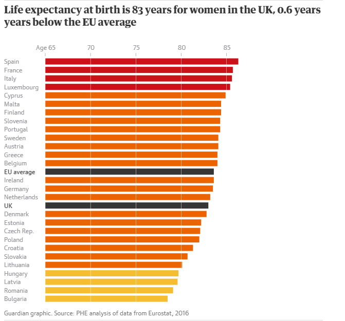 Το βρετανικό δημοσίευμα ωστόσο, πενθεί για την χαμηλή «απόδοση» των Αγγλίδων, το προσδόκιμο ζωής των οποίων, βρίσκεται κάτω από τον μέσο όρο της Ευρωπαϊκής Ενωσης, στα 83 έτη.