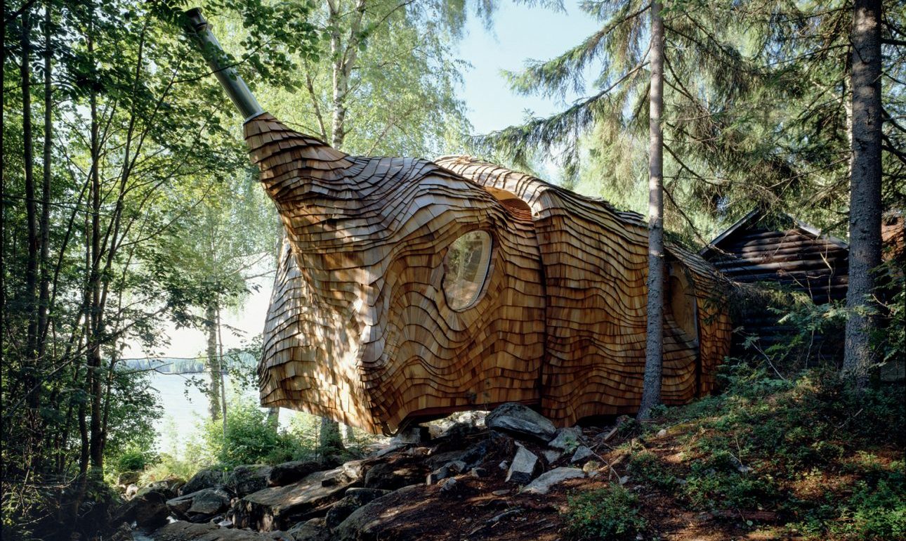 Με τον καιρό, η ξύλινη επιφάνεια θα γκριζάρει εξωτερικά, και δεν θα ξεχωρίζει ανάμεσα στα δέντρα και στο τραχύ, βραχώδες τοπίο που την περιβάλλει. Ενα άλλο έξυπνο τέχνασμα είναι ότι αυτή η ξύλινη κατασκευή μπορεί να προσαρμοστεί στο περιβάλλον ανάλογα με τις εποχές και τον αριθμό των επισκεπτών. Ετσι κατά τη διάρκεια του καλοκαιριού, το μπροστινό μέρος της καλύβας μπορεί να επεκταθεί σαν πρόβολος πάνω από το νερό, τα παράθυρα ανοίγουν εντελώς ώστε να ακούγεται το κελάρυσμά του, ενώ τον χειμώνα ή τις βροχερές μέρες ο πρόβολος τραβιέται και τα παράθυρα κλείνουν.