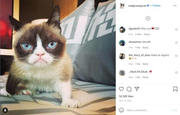 Από την άποψη κερδών, το αστέρι του διαδικτύου είναι η Grumpy Cat – το πραγματικό της όνομα Tardar Sauce. Σύμφωνα με εκτιμήσεις, άξιζε περίπου 100 εκατομμύρια δολάρια ή 84,5 εκατ. ευρώ πριν πεθάνει σε ηλικία 7 ετών. Eπασχε από νανισμό αιλουροειδών, κάτι που πιθανότατα, ευθυνόταν για το μικρό της μέγεθος αλλά και τα ιδιαίτερα χαρακτηριστικά της μουσούδας της. Είχε 1,5 εκατομμύριο followers στο Twitter, 2,4 εκατομμύρια στο Instagram και 8,5 εκατομμύρια ακολούθους στο Facebook.