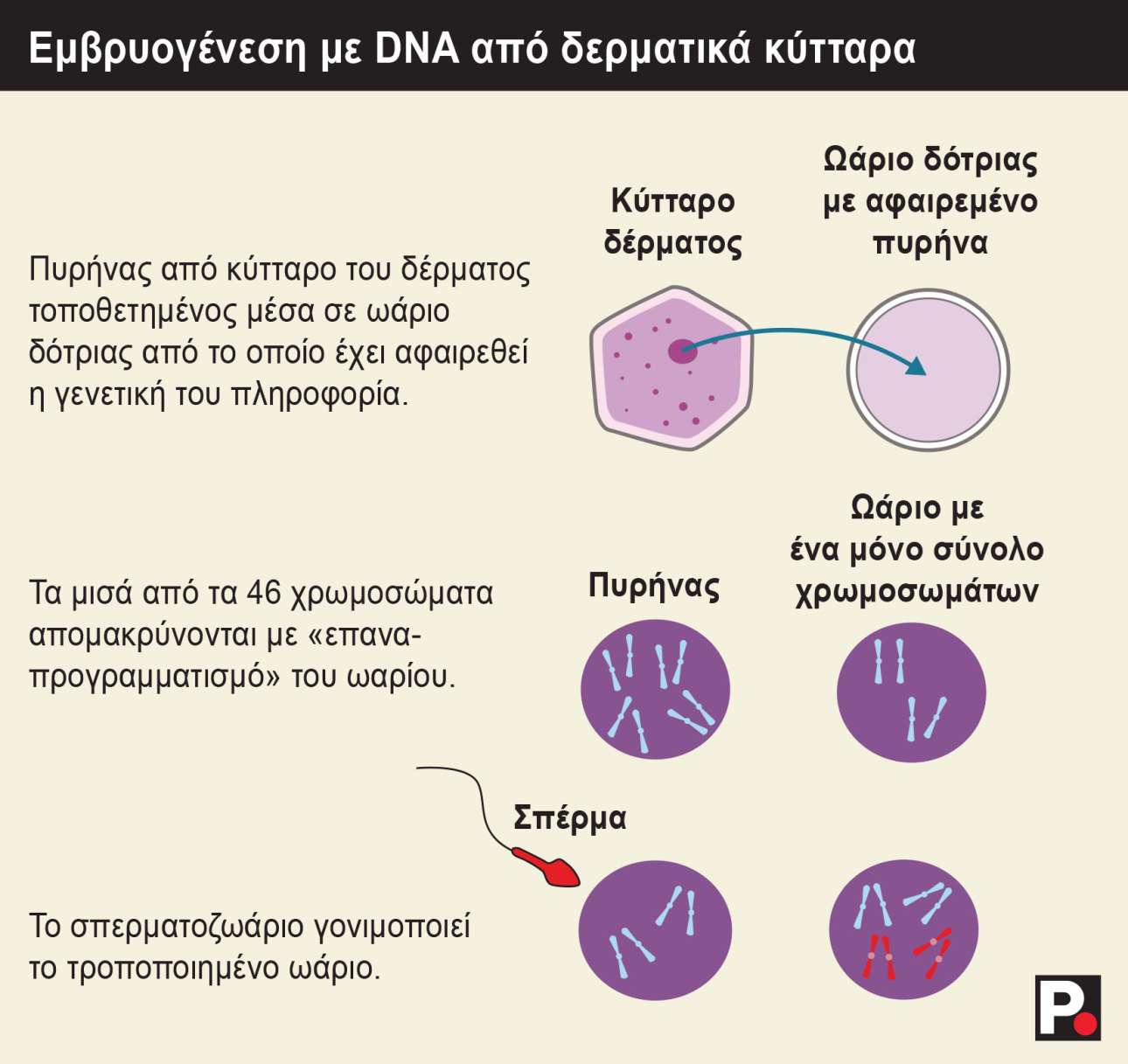 Η κύρια πρόκληση που αντιμετώπισαν οι επιστήμονες ήταν ότι τα ανθρώπινα ωάρια περιέχουν μόνο 23 χρωμοσώματα. Αλλα 23 προστίθενται με το σπερματοζωάριο κατά τη γονιμοποίηση και είναι απαραίτητα ώστε το γονιμοποιημένο ωάριο να αναπτυχθεί σε υγιές έμβρυο και τελικά σε μωρό. Ομως ο δερματικός πυρήνας περιείχε και τα 46 χρωμοσώματα που μεταφέρουν περίπου 20.000 γονίδια του ανθρώπινου γενετικό κώδικα.