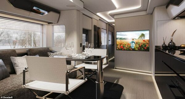 Στην καμπίνα του οδηγού υπάρχουν τέσσερις θέσεις που κάνουν και μασάζ ενώ στο καθιστικό υπάρχει ένα μεγάλος καναπές και δίπλα μια πλήρως εξοπλισμένη κουζίνα / Dembell