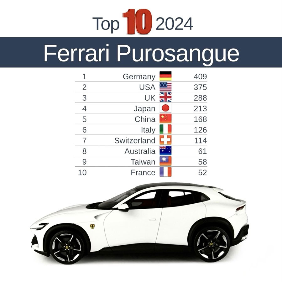 Εχετε την περιέργεια να μάθετε πόσα Purosangue πουλήθηκαν το 2024 στις δέκα πιο σημαντικές αγορές; Συνολικά 1.864 μονάδες, με τις περισσότερες εξ αυτών στη Γερμανία. Αναλυτικά, μπορείτε να δείτε τον σχετικό πίνακα παρακάτω.