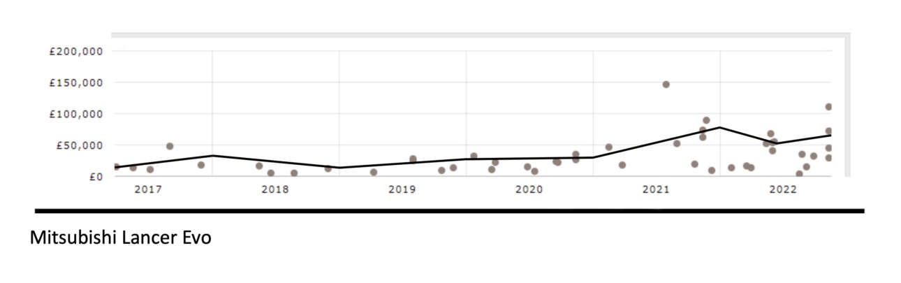 Βάλτε μέσα και την αίσθηση που τα περιτριγυρίζει, καθώς είναι βέβαιο πως όσο και πιο γρήγορα και να πηγαίνει ένα ηλεκτρικό με κάμποσες μπαταρίες, δεν ενέχει τον χαρακτήρα και τη σύνδεση με τον οδηγό του, και έχετε το σημερινό επενδυτικό «blue chip». Τι, όχι; Ρίξτε μια ματιά στο παραπάνω γράφημα με την ανάπτυξη τιμών των Mitsubishi Evo κατά την τελευταία πενταετία και μόνο. Μήπως πρέπει να γκουγκλάρουμε ξανά την αναζήτηση;