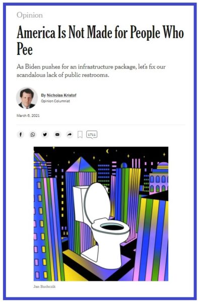 Εξάλλου, για να προβάλλουν το πρόβλημα οι New York Times με άρθρο (το υπογράφει ο αξιοσέβαστος Νίκολας Κρίστοφ) σημαίνει ότι αντικειμενικώς αυτό και υφίσταται και είναι οξύ. «Μιλώντας για τις υποδομές της Αμερικής, η πιο δυσάρεστη αποτυχία τους είναι η έλλειψη δημοσίων ουρητηρίων» λέει ο αρθρογράφος.