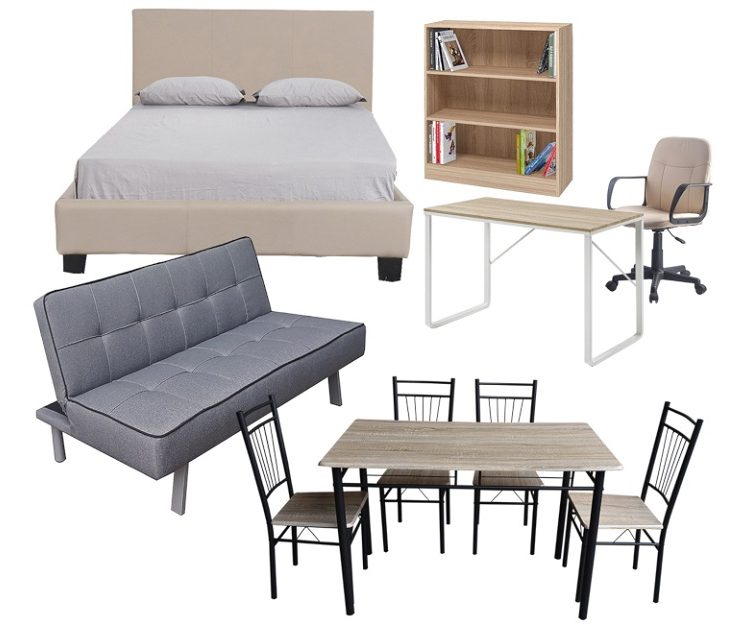 Ιδανικό για οικονομικό εξοπλισμό του φοιτητικού σπιτιού, το σετ αποτελείται από μίνιμαλ έπιπλα σε ουδέτερα χρώματα της εταιρίας Esmarket: γραφείο με διαστάσεις 120 x 60 x 75 εκ, καρέκλα γραφείου, βιβλιοθήκη από οικολογική μοριοσανίδα ευρωπαϊκής προέλευσης, τραπεζαρία με 4 καρέκλες, καναπέ που μετατρέπεται σε κρεβάτι καθώς και κανονικό κρεβάτι για στρώμα 120Χ200 εκ.