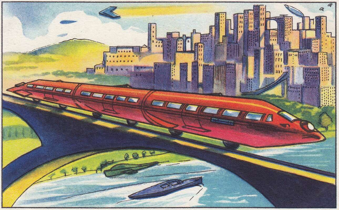 «Monorail» (μονοτρόχιος σιδηρόδρομος). «Προκειμένου να αυξηθεί η ταχύτητα της κυκλοφορίας, θα κατασκευαστούν σιδηροδρομικές γραμμές υψηλής ταχύτητας με μία σιδηροτροχιά, στην οποία τα βαγόνια θα κινούνται σε δύο τροχούς διατεταγμένους ο ένας πίσω από τον άλλο. Τα βαγόνια έχουν σχήμα σταγόνας για ελαχιστοποίηση της αντίστασης του αέρα. Ενα βαρύ γυροσκόπιο είναι ενσωματωμένο στη σιδηροδρομική μηχανή, ο άξονας του οποίου αντέχει σε όλες τις ανακλινόμενες κινήσεις. Για να μην πεταχτεί το τρένο από τις ράγες, κάτι που θα ήταν τρομερή ατυχία με την υψηλή ωριαία ταχύτητα των 500 χλμ., έχει σταθεροποιητικές επιφάνειες όπως ακριβώς ένα βαγόνι πυραύλων».