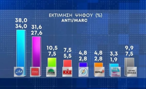 ♦ Η δημοσκόπηση της Marc για τον ΑΝΤ1, που επίσης παρουσιάστηκε την Παρασκευή 19 Μαΐου, δύο ημέρες πριν από τις κάλπες, έδινε στη Νέα Δημοκρατία 34% έως 38% και στον ΣΥΡΙΖΑ από 27,6% έως 31,6%. Το αποτέλεσμα βρέθηκε και εδώ εκτός του εύρους των ποσοστών και για τα δύο κόμματα, ενώ και η διαφορά μεταξύ τους ήταν περίπου τριπλάσια.