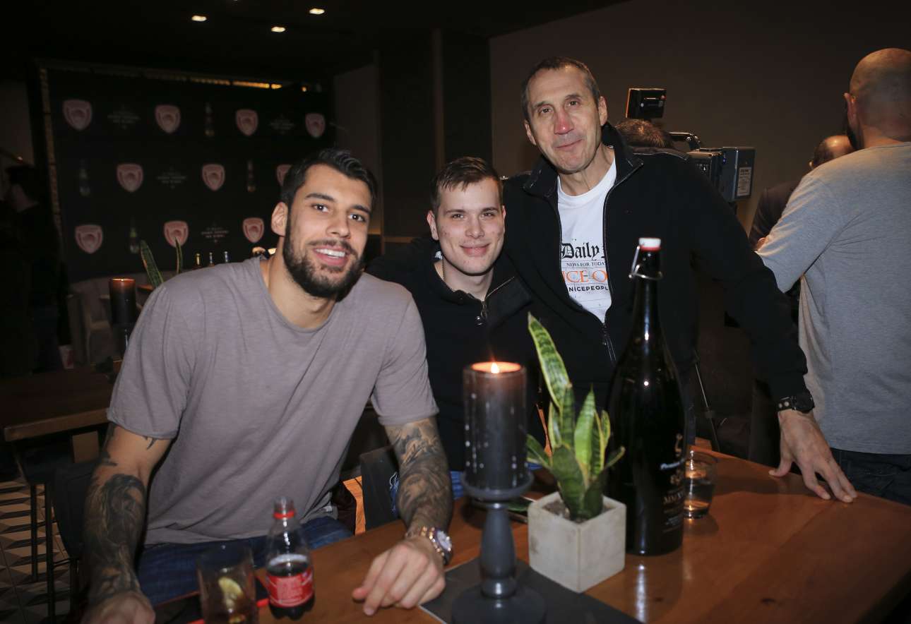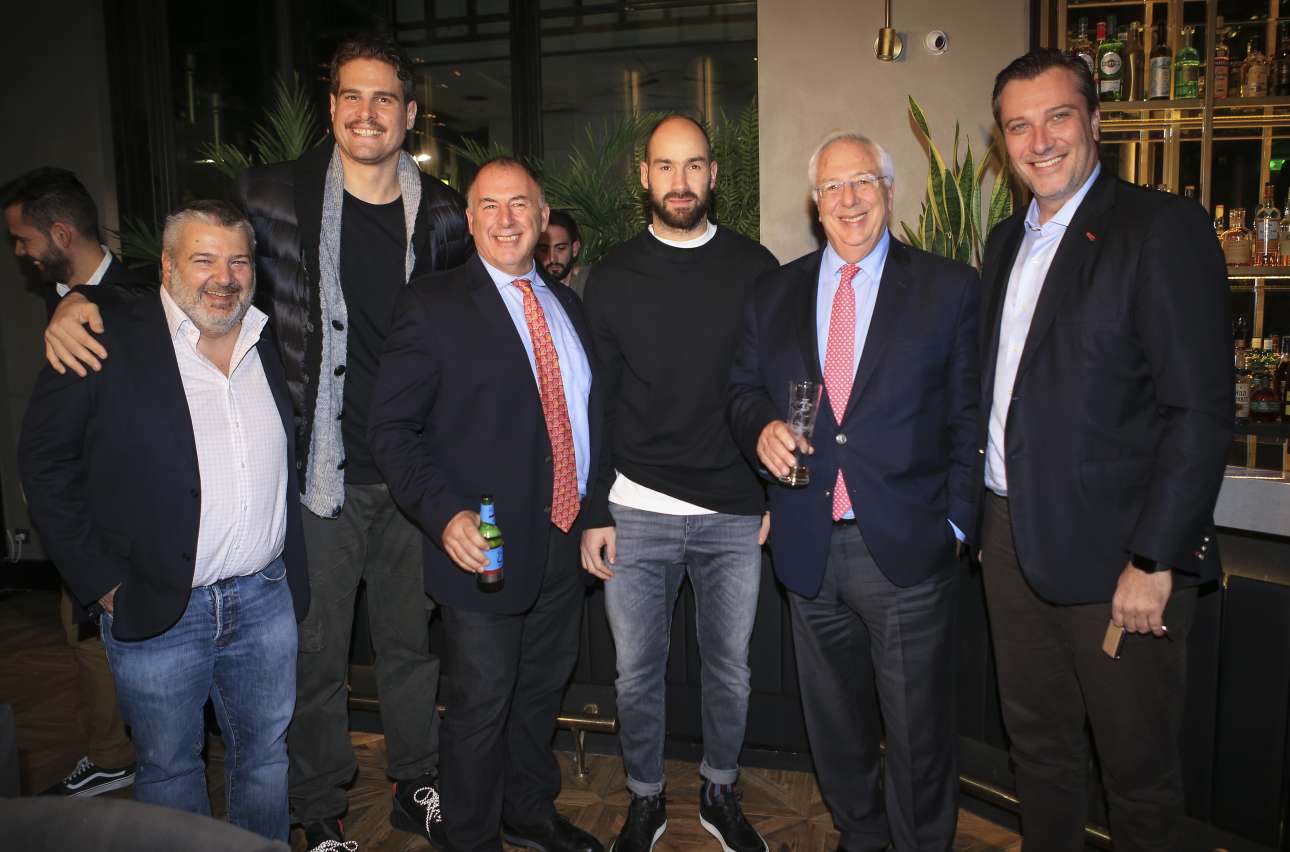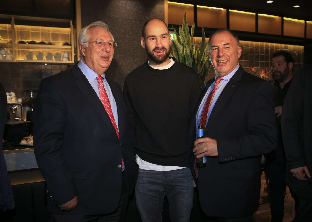 Από αριστερά: ο αντιπρόεδρος της Ελληνικής Ζυθοποιίας Αταλάντης, Νικόλαος Ζωγόπουλος ο αρχηγός της ομάδας μπάσκετ του Ολυμπιακού, Βασίλης Σπανούλης και ο γενικός διευθυντής της Ελληνικής Ζυθοποιίας Αταλάντης, Τζώρτζης Κανακάρης