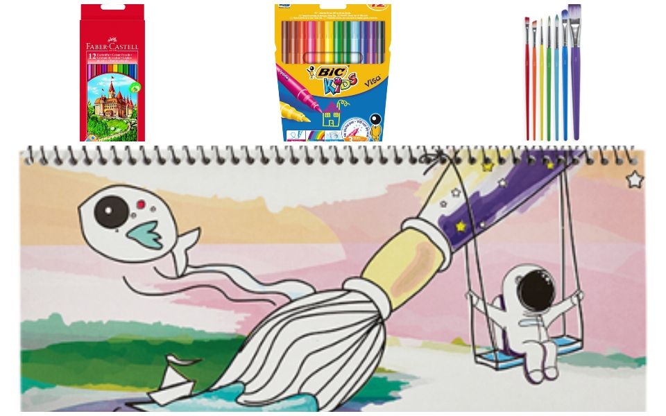 Ένα μπλοκ ακουαρέλας, ξυλομπογίες σε διάφορα χρώματα της κορυφαίας εταιρείας Faber-Castell, μαρκαδόρους που τα χρώματά τους μπορούν να αφαιρεθούν εύκολα από χέρια και ρούχα σε περίπτωση ατυχήματος και τέλος πινέλα σε διάφορα μεγέθη για ακόμα περισσότερη δημιουργικότητα.