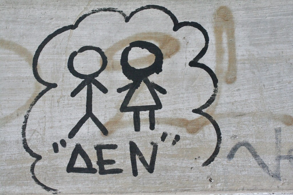 Τα μηνύματα σε αυτή την περίπτωση αλλάζουν ύφος και το χιούμορ (συχνά, με χτυπήματα κάτω απ’ τη μέση) παίρνει το λόγο: «Είναι να μην μπλέξεις με Γιώργο!» γράφει κάποια, πιθανότατα παθούσα, σε μια γωνιά της Αθήνας. Ο τρόπος που λέμε «σ’ αγαπώ» αλλάζει, καθώς οι σχέσεις μας εξελίσσονται. Ένα πράγμα όμως είναι βέβαιο –το χιούμορ συχνά βοηθά.