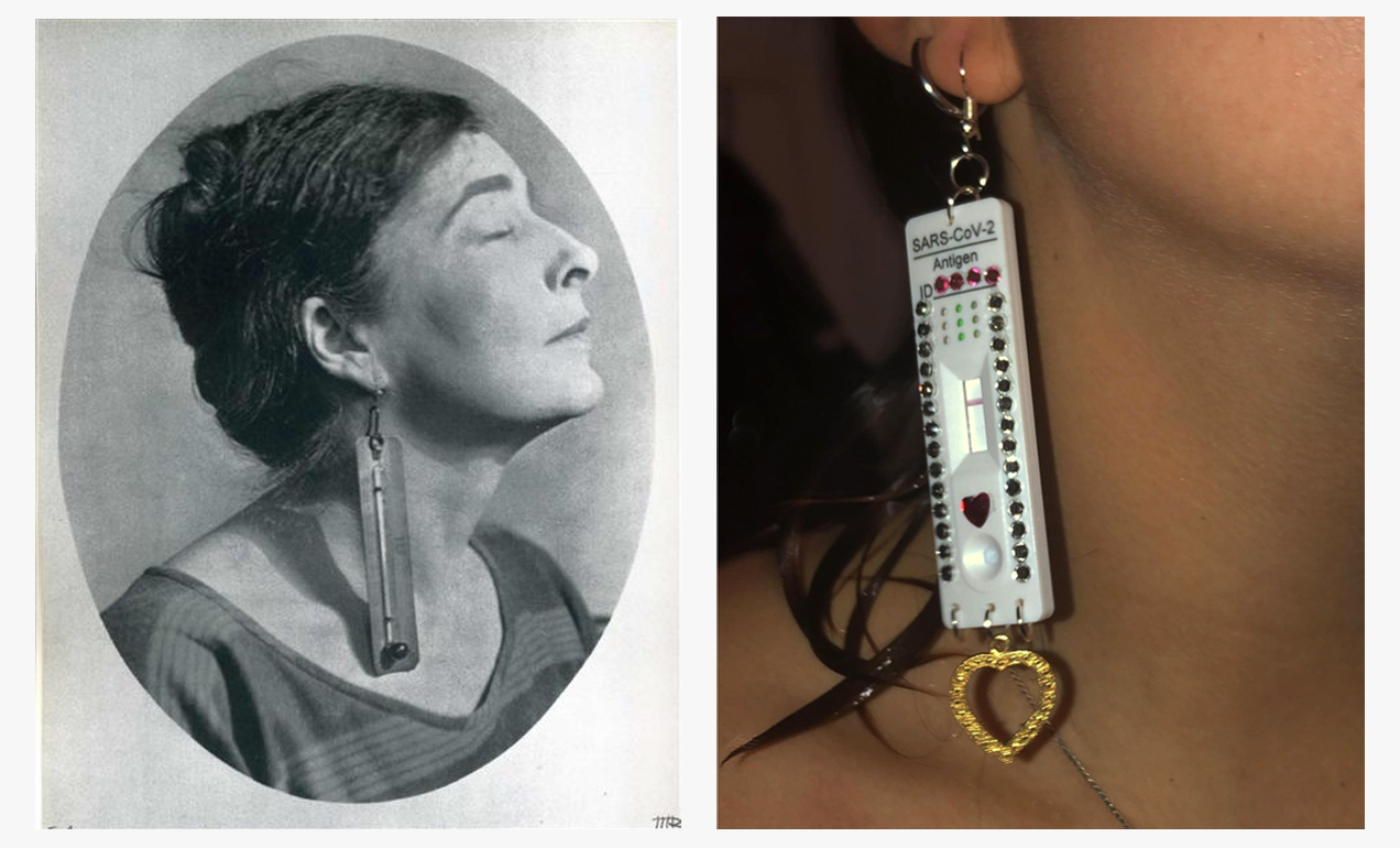 Εκατό χρόνια αργότερα, στα τέλη του 2021, μια άλλη γυναίκα κρεμάει στο αυτί της ένα αρνητικό rapid test Covid-19. Είναι διακοσμημένο με στρας και μια χρυσή καρδιά.