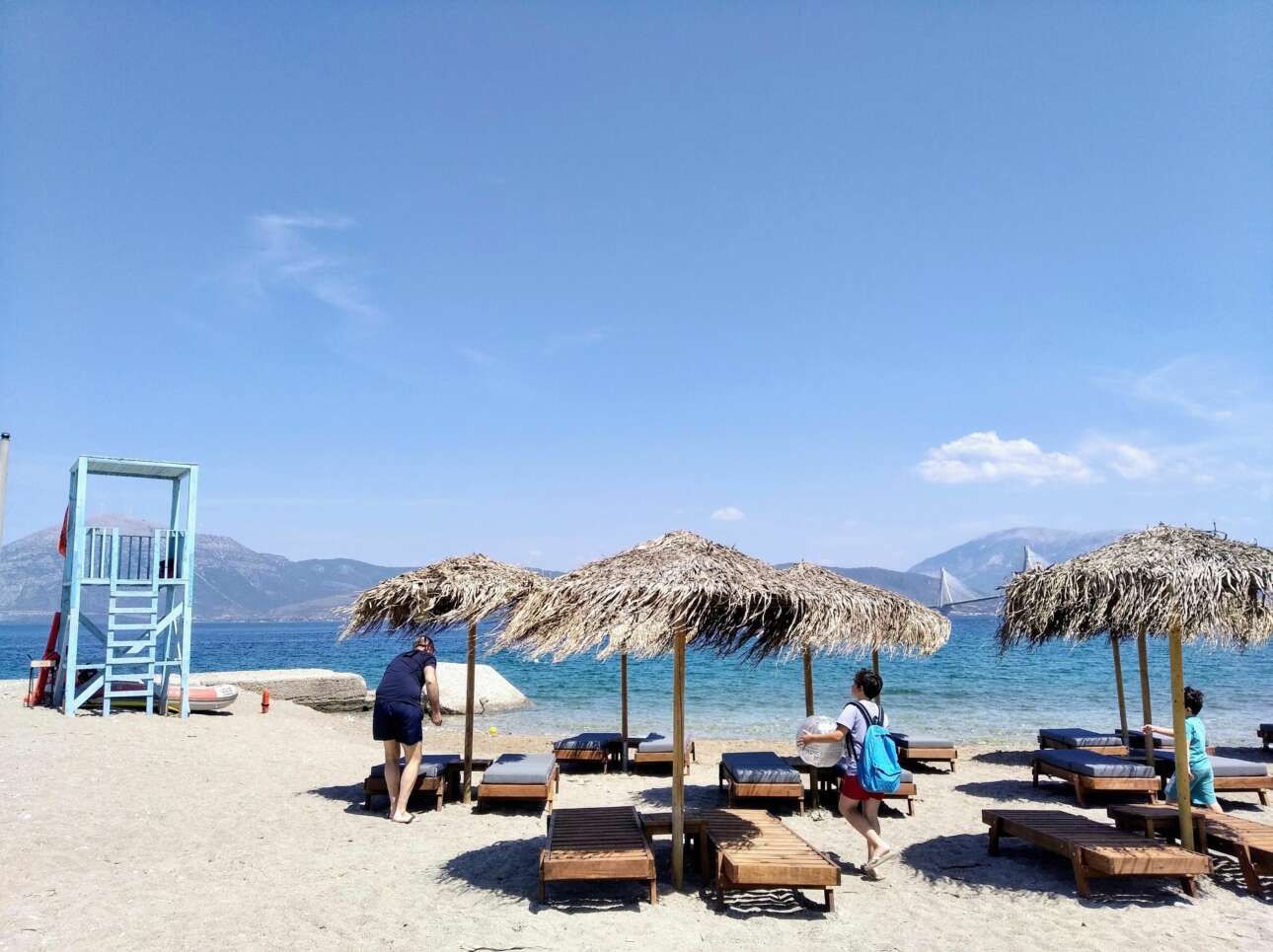 Ενα μεγαλύτερης ηλικίας πλατάνι ρίχνει την παχιά σκιά του στην επάνω πλευρά της πισίνας κι εγώ, ορεσίβια από καταγωγή, δεν θα μπορούσα να διαλέξω καλύτερο μέρος για να πιώ τον καφέ μου. Ποτέ και πουθενά δεν έχω καθίσει τόση ώρα ρεμβάζοντας γιατί ήταν δροσερά, γιατί το θρόισμα των πλατανόφυλλων με γαλήνευε, γιατί η θέα από το σημείο αυτό στην καλωδιωτή γέφυρα, που ενώνει το Ρίο με το Αντίρριο, είναι μοναδική, καθώς η εικόνα της παιχνιδίζει κάτω από τις ομπρέλες των πεύκων.