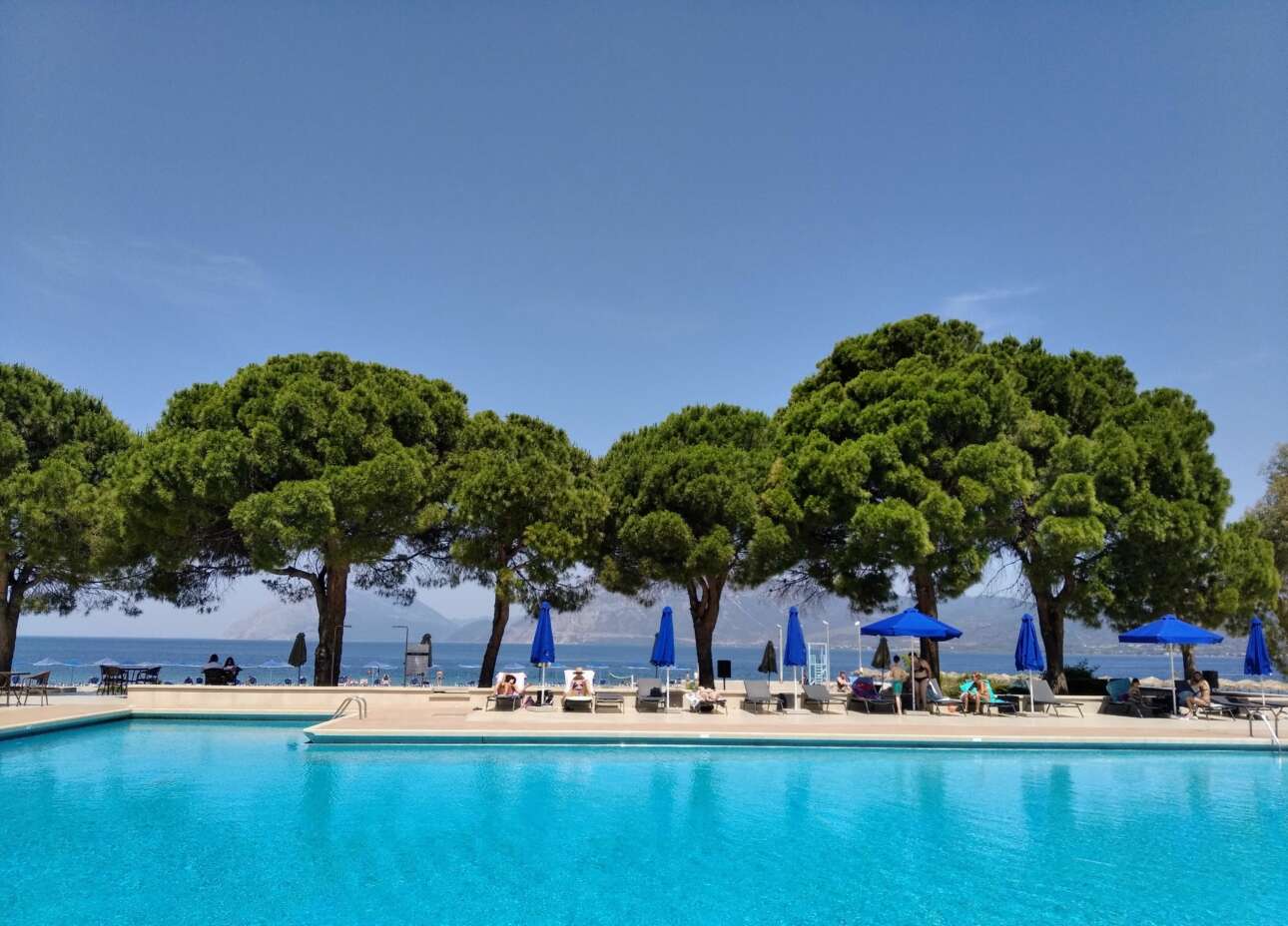 Τα θυμήθηκα, γιατί μια σειρά από υπέροχα πεύκα όπως εκείνα, ήταν το πρώτο πράγμα που μου έκανε εντύπωση, όταν έφτασα στο Porto Rio Hotel, έξω από την Πάτρα. Ρωμαλέα και μάλλον κοντά σε σχέση με τα αρχαία πεύκα της Ρώμης (πράγμα αναμενόμενο αφού τούτα εδώ είναι το πολύ 25 ετών) δημιουργούν ένα φυσικό όριο ανάμεσα στην πισίνα του ωραίου ξενοδοχείου και την παραλία.