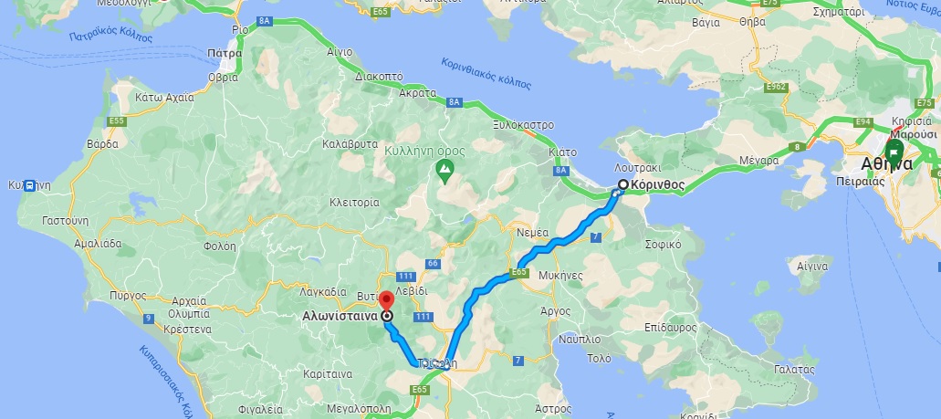 - Στην Ε/Ο για Τρίπολη, στρίβετε δεξιά για Νεμέα και ακολουθείτε τη διαδρομή προς Λεβίδι, μέσω Σκοτεινής, Κανδήλας, Παλαιόπυργου. Από το Λεβίδι κατευθύνεστε προς τη Βυτίνα και από εκεί στρίβετε για Αλωνίσταινα.