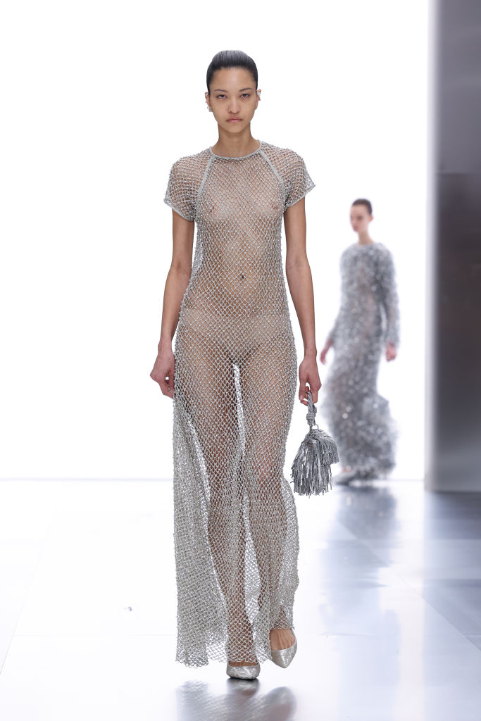 Αλλοι σχεδιαστές έχουν παρουσιάσει κολεξιόν με βολάν και φρίλια σε επιχρυσωμένα δωμάτια ροκοκό, ο Fendi, όμως, ένας οίκος σχετικά νέος στο παιχνίδι -παρουσίασε την πρώτη του επίδειξη υψηλής ραπτικής μόλις το 2017– το κάνει διαφορετικά. Το σκηνικό του ντεφιλέ θύμισε το όχι και τόσο μακρινό μέλλον του «Γκάτακα» (1997) με ασημί τοίχους και πολύ λευκό φως. Μαυροφορεμένοι υπηρέτες με ξεσκονόπανα στα παπούτσια τους γλιστρούσαν πάνω στο αλουμινένιο πάτωμα για να εξαφανίσουν τυχόν σημάδια και γρατσουνιές.
