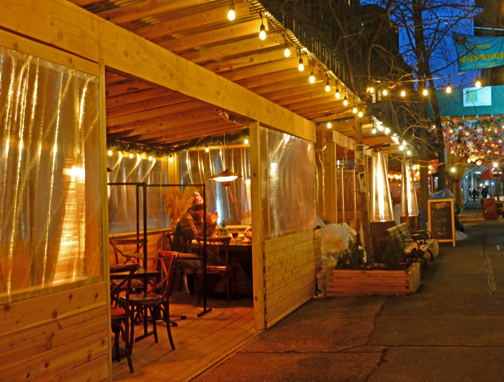 Ξύλινα υπόστεγα με τζαμαρίες ή διάφανο πλαστικό, θερμάστρες και καλό εξαερισμό άρχισαν να εμφανίζονται σαν προεκτάσεις των μπαρ και των εστιατορίων της Νέας Υόρκης, δίνοντας τη δυνατότητα στους πιο διστακτικούς να απολαύσουν ξανά τα αγαπημένα τους κοκτέιλ και πιάτα.