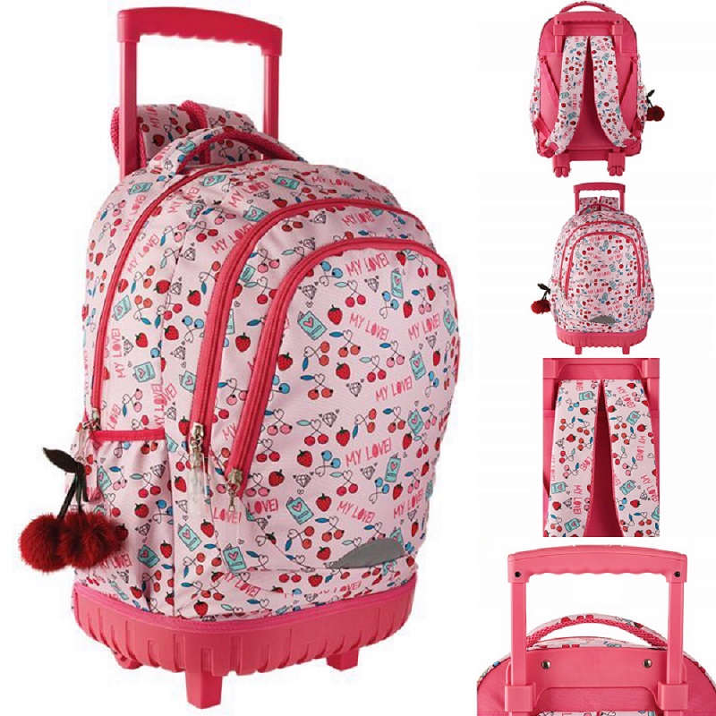 Αν πάλι διαλέξετε τρόλεϊ, ελέγξτε τα ροδάκιά του, που θα πρέπει να είναι καλής ποιότητας γιατί σε αντίθετη περίπτωση θα χαλάσουν πολύ γρήγορα. Ελέγξτε επίσης το χερούλι του τρόλεϊ, που θα πρέπει να έχει το κατάλληλο ύψος ώστε το παιδί να μην αναγκάζεται να σκύβει για να το σύρει.