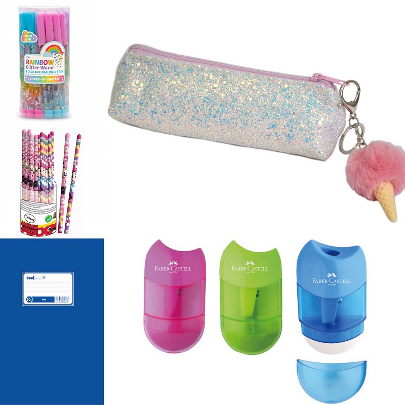 Εκτός από την τσάντα, η λίστα των σχολικών ειδών περιλαμβάνει επίσης κασετίνα, γραφική ύλη, μολύβια μηχανικά ή κλασικά, γόμα και ξύστρα, στιλό και μαρκαδόρους, ξυλομπογιές, τέμπερες και νερομπογιές, πλαστελίνες, ψαλίδι και άλλα υλικά χειροτεχνίας, τετράδια, μπλοκ και ντοσιέ, και γεωμετρικά όργανα, που διαφέρουν ανάλογα με την τάξη του παιδιού (χάρακας, διαβήτης, τρίγωνο, μοιρογνωμόνιο).
