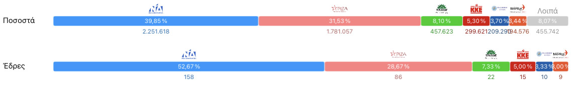 Οι προηγούμενες εθνικές εκλογές, τον Ιούλιο του 2019, έγιναν με το σύστημα της ενισχυμένης αναλογικής. Οπως και αποτυπώνεται παρακάτω, το πρώτο κόμμα ευνοείται σε ποσοστό εδρών κυρίως εις βάρος των δύο επομένων στην κατάταξη, ενώ τα μικρότερα λαμβάνουν σχετικά αναλογικά τις έδρες τους. Με το ίδιο ποσοστό περίπου αλλά μικρότερο αριθμό ψήφων, το πρώτο κόμμα έβγαλε 12 έδρες παραπάνω το 2019 από ό,τι το 2023.