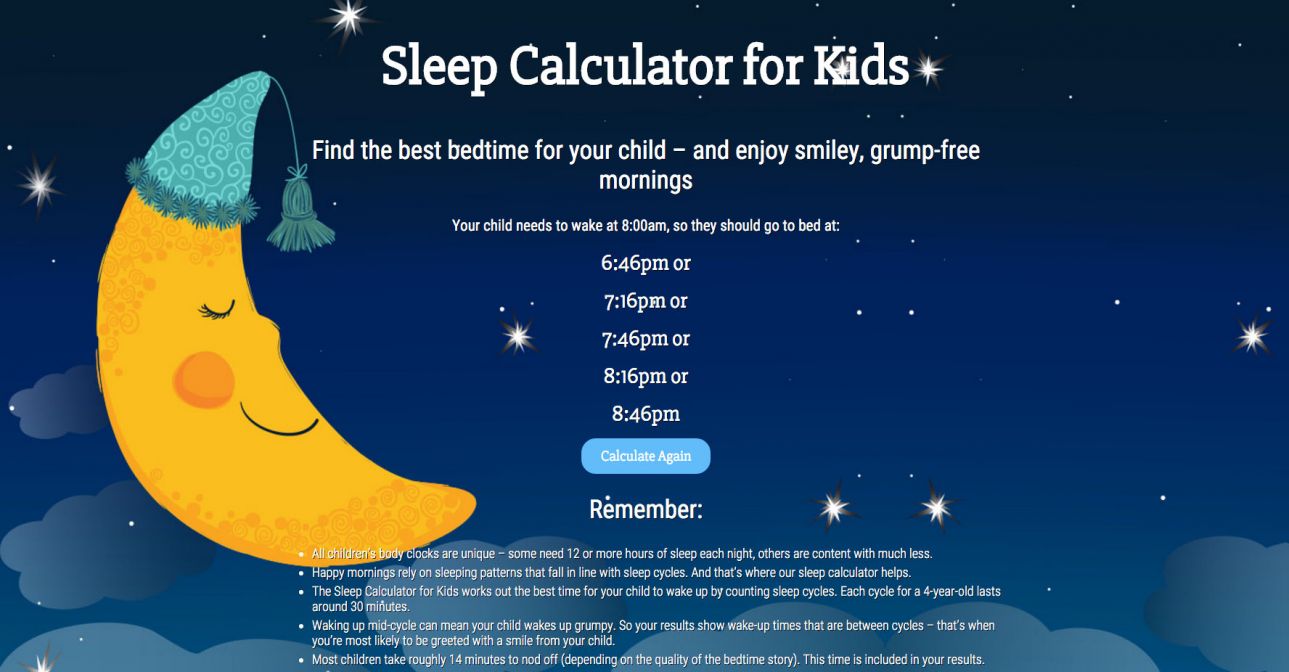 Καθώς ορισμένα παιδιά έχουν ανάγκη περισσότερο χρόνο ύπνου από άλλα, οι γονείς καθοδηγούνται να επιλέγουν την ώρα που ταιριάζει περισσότερο με τις ανάγκες του παιδιού τους. Οπως επισημαίνει στην Ναόμι Γκρήναγουεϊ και στο dailymail.co.uk η σύμβουλος ύπνου Λούσι Σρίμπτον «ανεξάρτητα από τη διάρκεια του ύπνου, το ξύπνημα μία στιγμή που δεν διακόπτει τον βαθύ ύπνο εξασφαλίζει ένα ιδανικό ξεκίνημα στη μέρα του παιδιού». Σύμφωνα με τον υπολογιστή, ένα τετράχρονο που χρειάζεται να ξυπνήσει στις 7 π.μ. θα πρέπει να πέσει για ύπνο στις 5:46 μ.μ. της προηγουμένης ή στις 6:16 μ.μ. ή στις 6:46 μ.μ. ή στις 7:16 μ.μ. ή στις 7:46 μ.μ. με βάση ένα μέσο κύκλο ύπνου που διαρκεί 30 λεπτά της ώρας. Την ίδια στιγμή, ένα 7χρονο παιδί που πρέπει να σηκωθεί την ίδια ώρα, θα χρειαστεί να πέσει για ύπνο στις 7:56 μ.μ. ή στις 8:46 μ.μ. ή στις 9:36 μ.μ. με βάση τον κύκλο ύπνου της ηλικίας του που διαρκεί 50 λεπτά της ώρας.